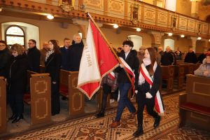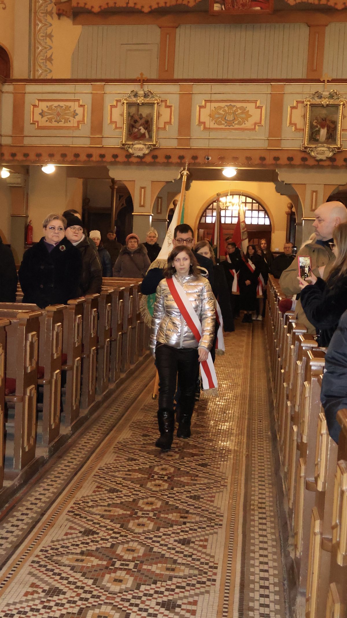 • Poczet sztandarowy stoi przed wejściem do kościoła