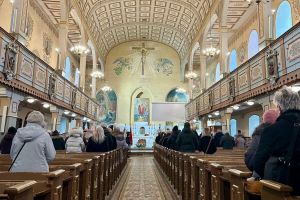 • Widok od strony wejścia głównego na wnętrze kościoła podczas mszy św.