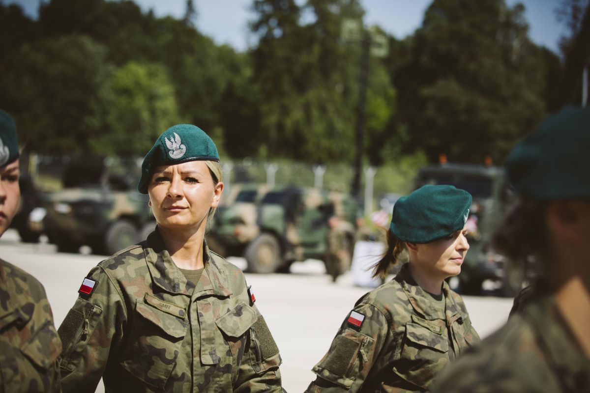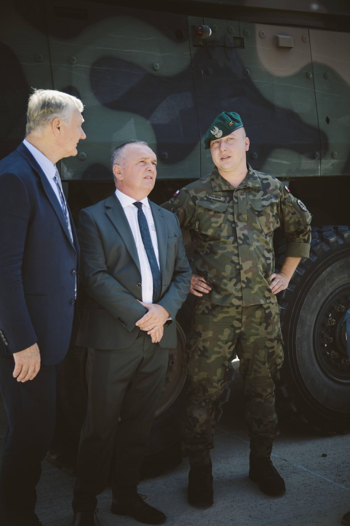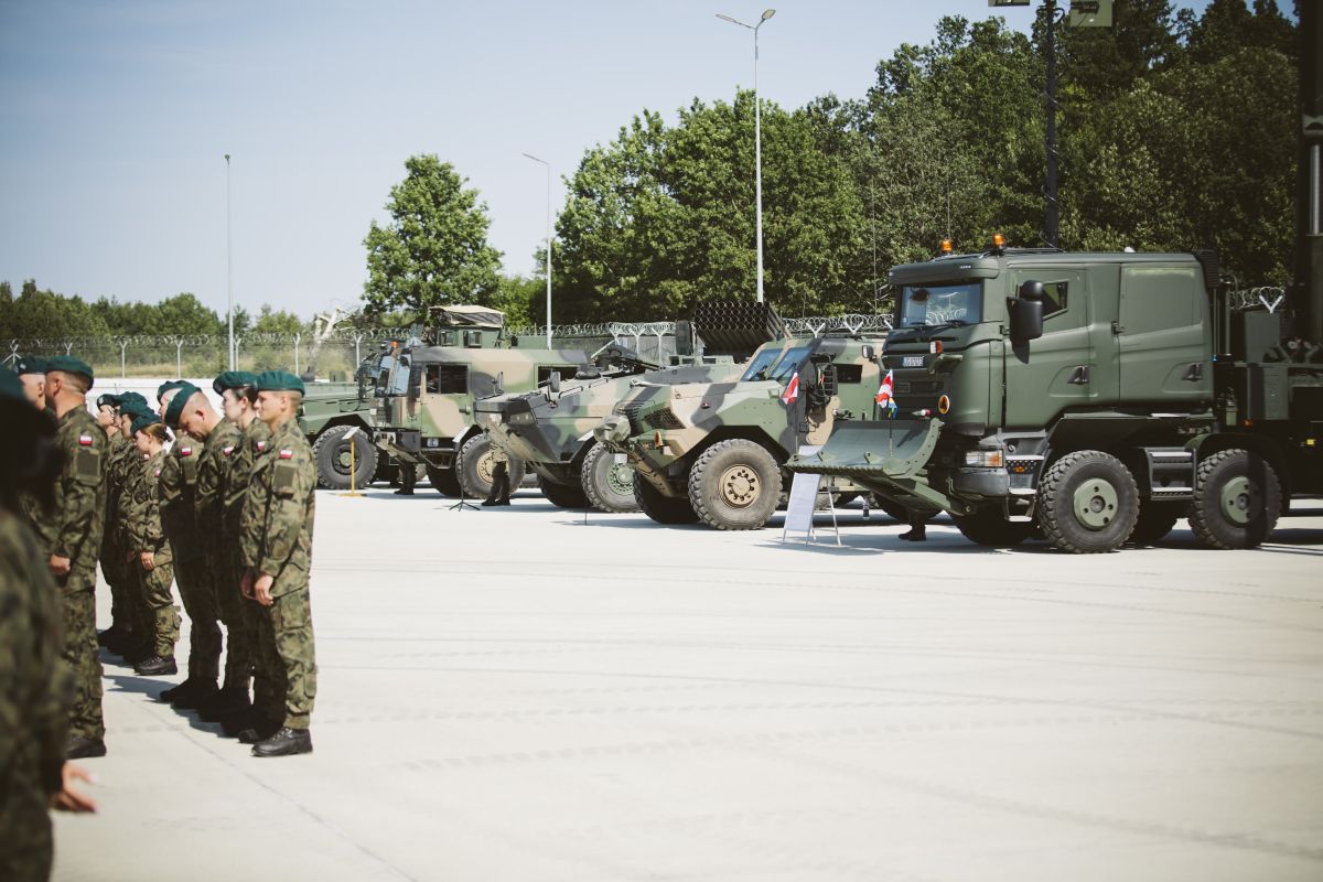 • Żołnierze stoją na tle sprzętu wojskowego