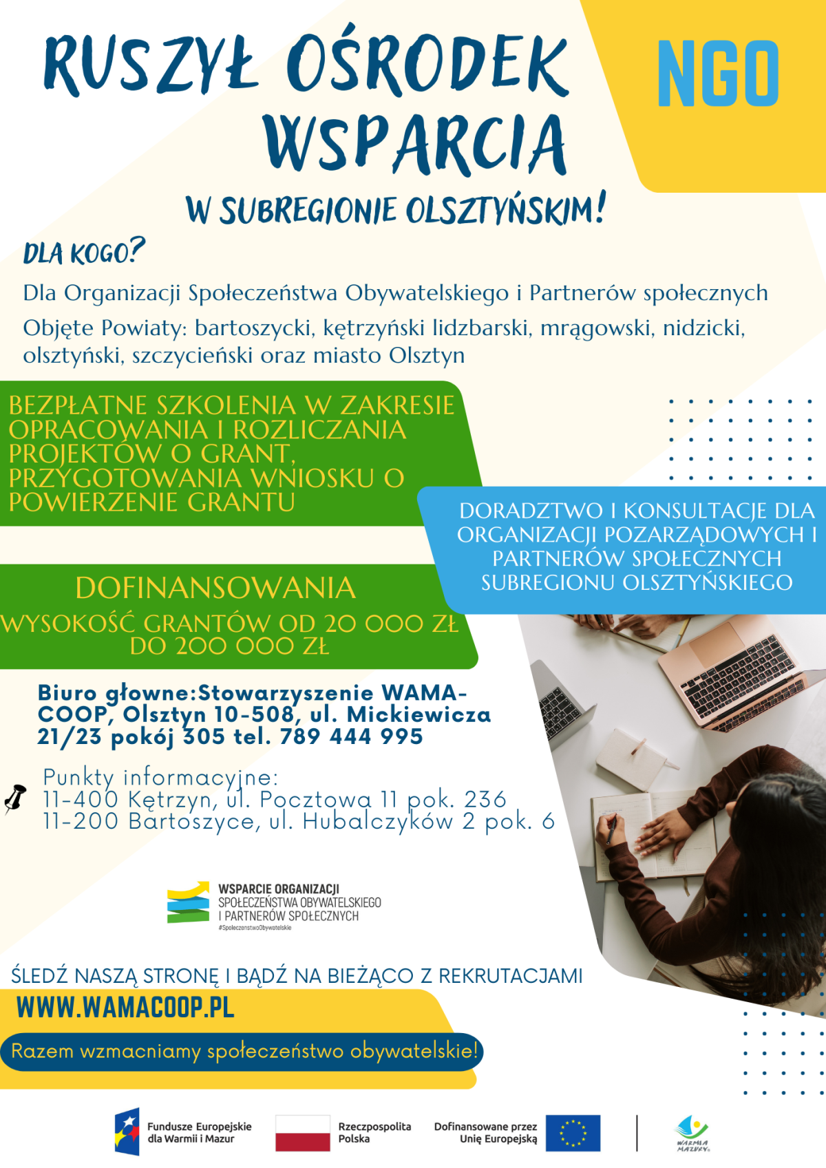 Stowarzyszenie na Rzecz Rozwoju Spółdzielczości i Przedsiębiorczości WAMA-COOP zostało oddelegowane przez Urząd Marszałkowski w Olsztynie do wsparcia podmiotów NGO w procesie pisania wniosku poprzez indywidualne konsultacje i szkolenia.